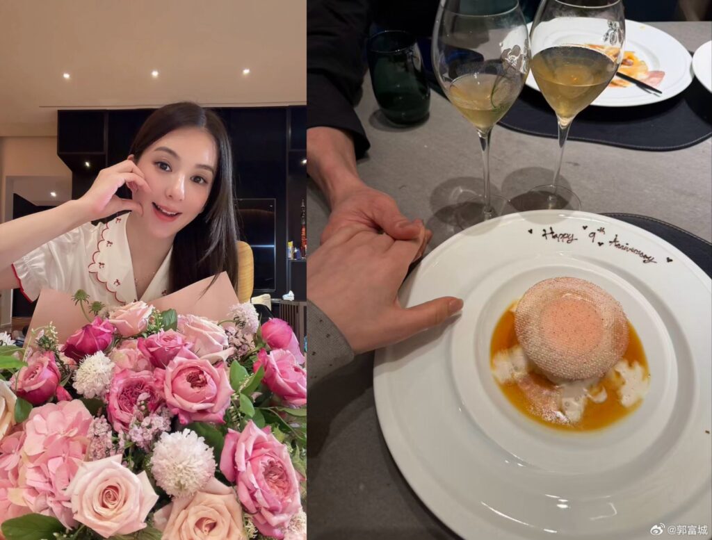 天王郭富城與妻子方媛在4月18日迎來結婚9週年。方媛在社群平台上甜蜜曬出照片,畫面中兩人並肩而坐,面前擺著香檳杯,方媛托腮微笑,郭富城則俏皮地用手比出「9」的手勢,兩人還一起對著甜點比YA,互動非常甜蜜。