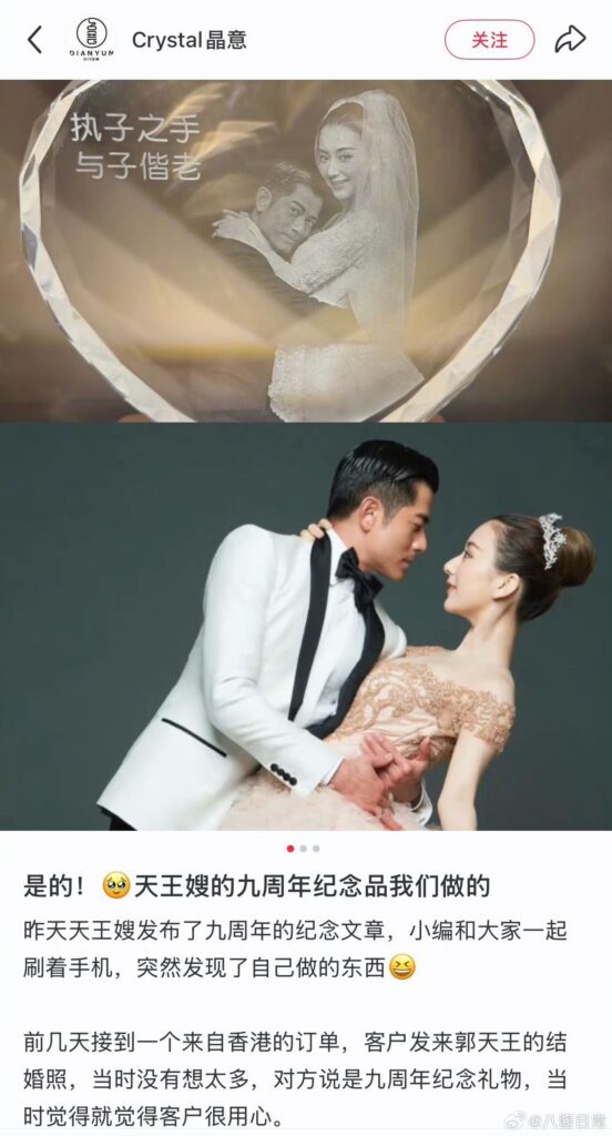 為了紀念攜手走過9年,郭富城與方媛特別訂製了一對水晶擺飾,上面都刻有兩人的婚紗照與「執子之手,與子偕老」的誓詞。方媛的是一款心形發光水晶燈,折扣後的價格僅235元;而郭富城的則是一款方形藍牙喇叭擺飾,售價338元。商家透露,幾天前收到來自香港的訂單,當時客戶提供郭富城的結婚照,他們還沒想太多,只覺得「客戶很用心」,沒想到幾天後就在郭富城的社群平台上看到這兩款訂製商品。