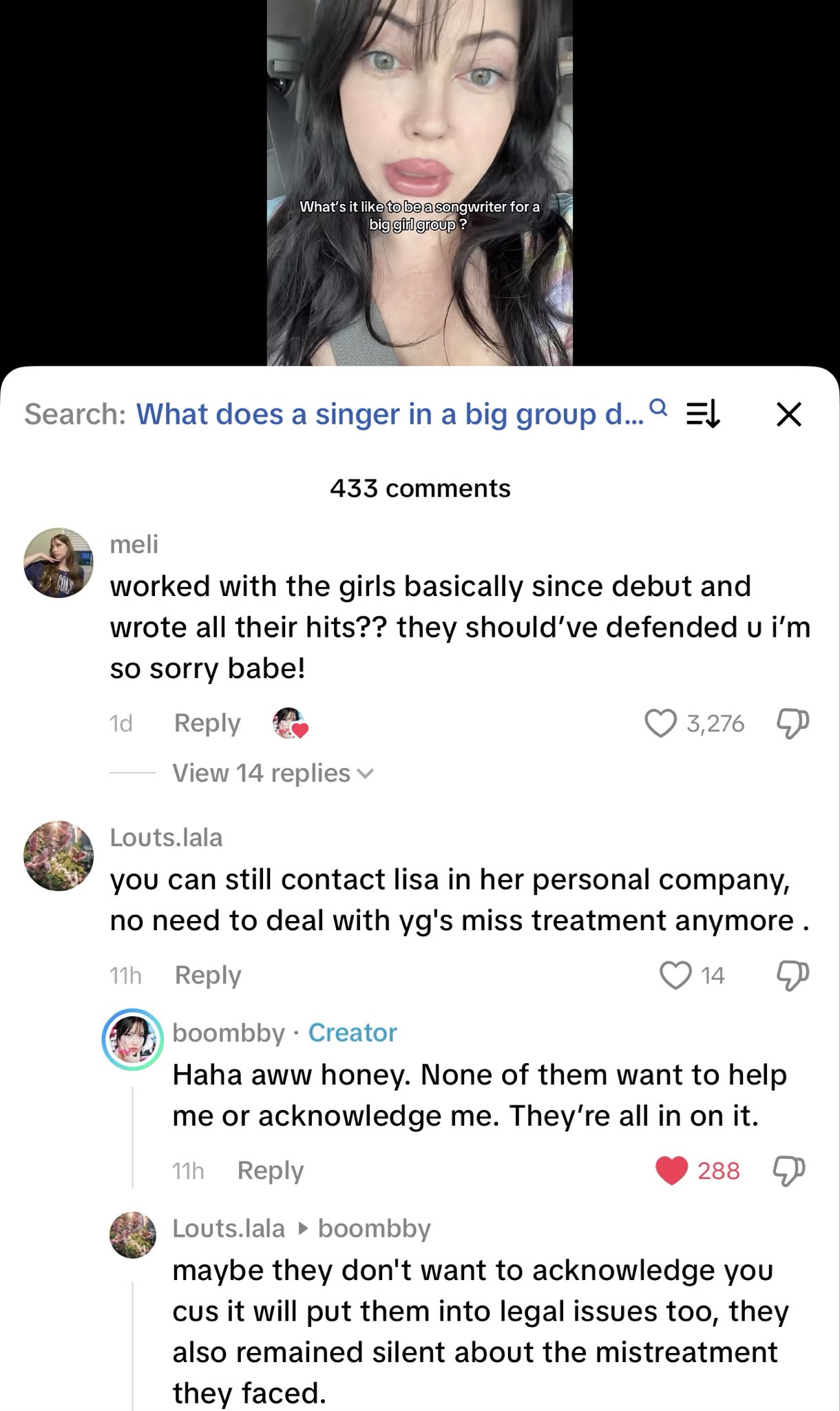 除了針對公司的控訴,Bekuh BOOM也將矛頭指向曾密切合作的BLACKPINK。她提到在製作〈Typa Girl〉時感受到明顯的不尊重,甚至有工作人員當面羞辱她,稱公司之所以選擇與她合作,是因為她「願意接受較低的酬勞」。