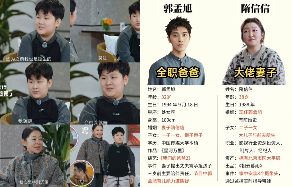 節目中,繼父郭孟旭的差別對待,讓橙子被迫變得早熟。在母親再婚的家庭裡,他展現出讓人心疼的「懂事」:肚子餓了只敢自己默默翻找零食填飽肚子、主動照顧同母異父的弟妹,在飯桌上也總是安靜退讓。他稱呼繼父為「舅舅」,坦承兩人之間沒有血緣關係,甚至覺得就算曾有過擁抱也早就忘了。種種壓抑自我的行為,被心理專家視為孩子在缺乏安全感的環境中,發展出來的生存策略。