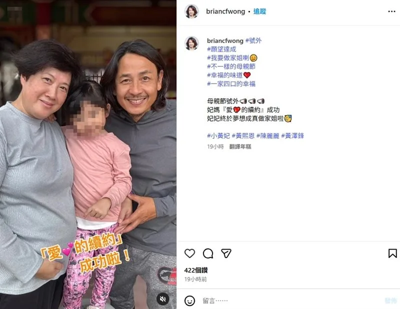 港星黃澤鋒5日透過IG宣布58歲妻子懷孕的喜訊,曬出合照開心表示:「愛的續約,成功!」並興奮地說女兒即將升格當姐姐,「不一樣的母親節,幸福的味道,一家四口的幸福。」黃澤鋒透露,夫妻倆一直有生第二胎的計畫,這次在醫師建議下接受人工受孕,如今已順利懷孕5個月。