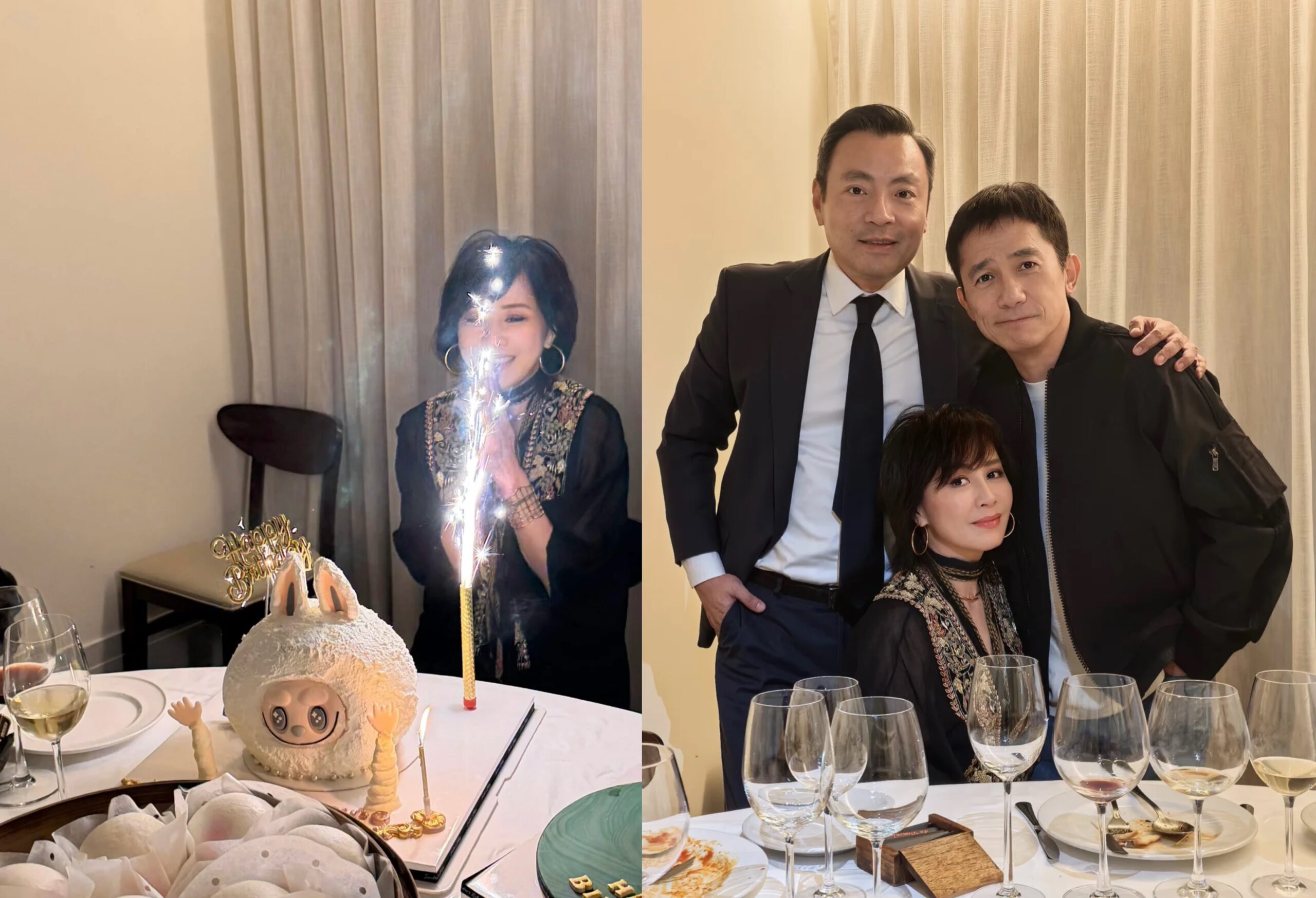 這場私人宴會由九龍巴士後人雷兆光夫婦協助籌辦,場地可遠眺維多利亞港夜景。最吸睛的是特製Labubu蛋糕,奶油裱花中藏有60顆覆盆子,糖霜還重現劉嘉玲歷年金像獎典禮的經典造型,頂端水晶標牌刻著「Carina 60」。壽桃包也融入創意,升級為黑松露流心版本,將傳統寓意與現代口味結合。