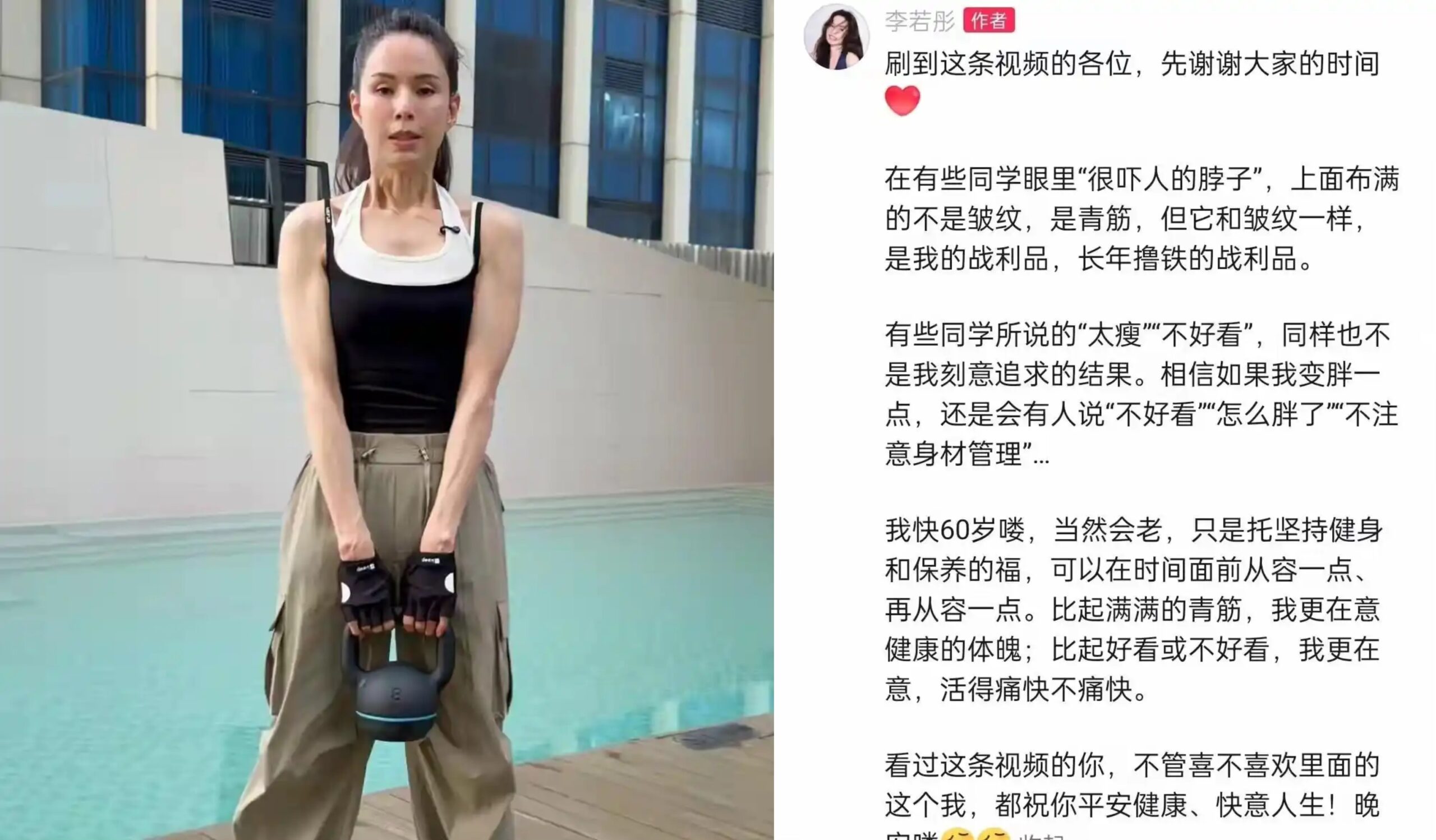 「姑姑」李若彤又因狀態登上熱搜!近日她在社群平台分享健身影片,身穿運動背心大秀緊實線條,卻因頸部明顯的縱向肌肉引發討論。有網友擔心「太瘦會顯老」,她隨即在留言區霸氣回覆:「那是青筋,不是皺紋!」一句話化解爭議,也展現她一貫的率真自信。