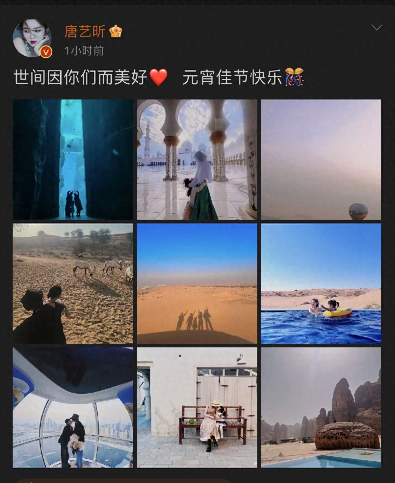 而《甄嬛傳》中「雖然愚蠢卻實在美麗」的祺貴人唐藝昕,也在個人社交帳號上分享與家人團聚過節的畫面,其中一張與張若昀親吻的照片更是吸引無數網友的留言按讚。據悉早在2月2日,就有網友在阿布扎比偶遇張若昀一家,當時唐藝昕牽著女兒走在前面,張若昀緊隨其後,兩人的身材和顏值非常吸引人。2月11日,沙特當地的導遊也曬出了與唐藝昕夫婦的合照,稱接待了他們,私下裡非常恩愛。