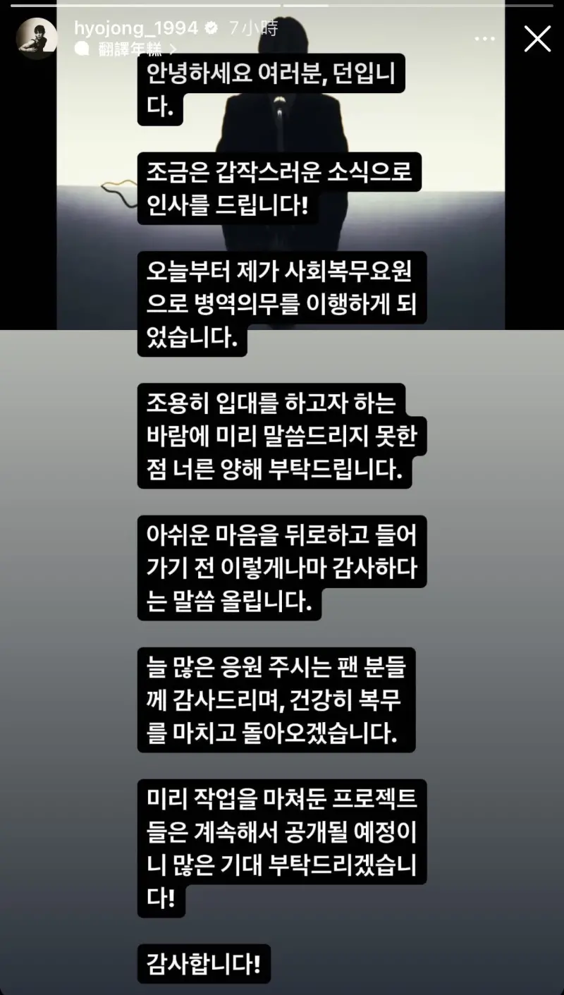 媒體也公開 DAWN 今年年初就被判定為替代役,因為 DAWN 從很久以前就患有嗜睡症,加上嗜睡症普遍症狀包含過度嗜睡、猝倒、產生幻覺、睡眠麻痺、夜間睡眠障礙等,DAWN 身邊友人為此非常擔心,這也可能是他當替代役的其中原因。(原文出處)
