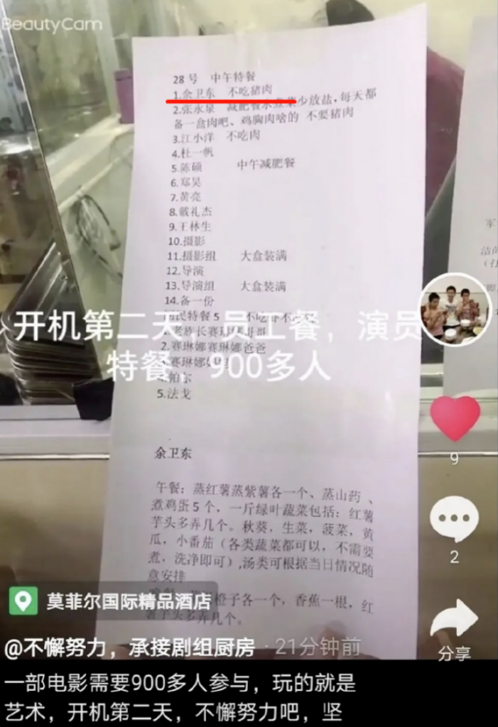 兩人的飲食習慣也奇妙地相似。維族人迪麗熱巴不吃豬肉,漢族人黃景瑜疑似從喜歡豬肉變得不吃豬肉。《維和防暴隊》劇組曾流出一張點餐備註清單,余衛東是黃景瑜的角色名。