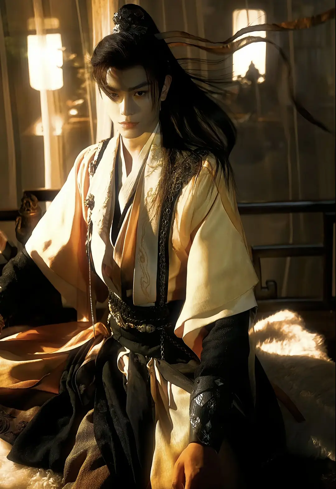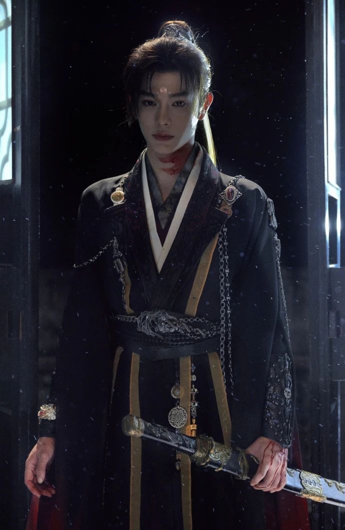 據悉,這組照片是出自大陸知名古風攝影師夏棄疾,劇熱度剛起來的時候,正是因為她為丁禹兮拍的那組黃衣少年古裝「神圖」在社交平臺刷屏,吸引了很多圈外觀眾入坑《永夜》。精心繁複的場景佈置、鬼魅妖異的光影鋪陳,陰影裏若隱若現的少年、戰損感滿滿的帶血妝造,配合上小丁鋒芒逼人的眼神,也將慕子期的少年病嬌心性,表現得更加濃烈、張揚。