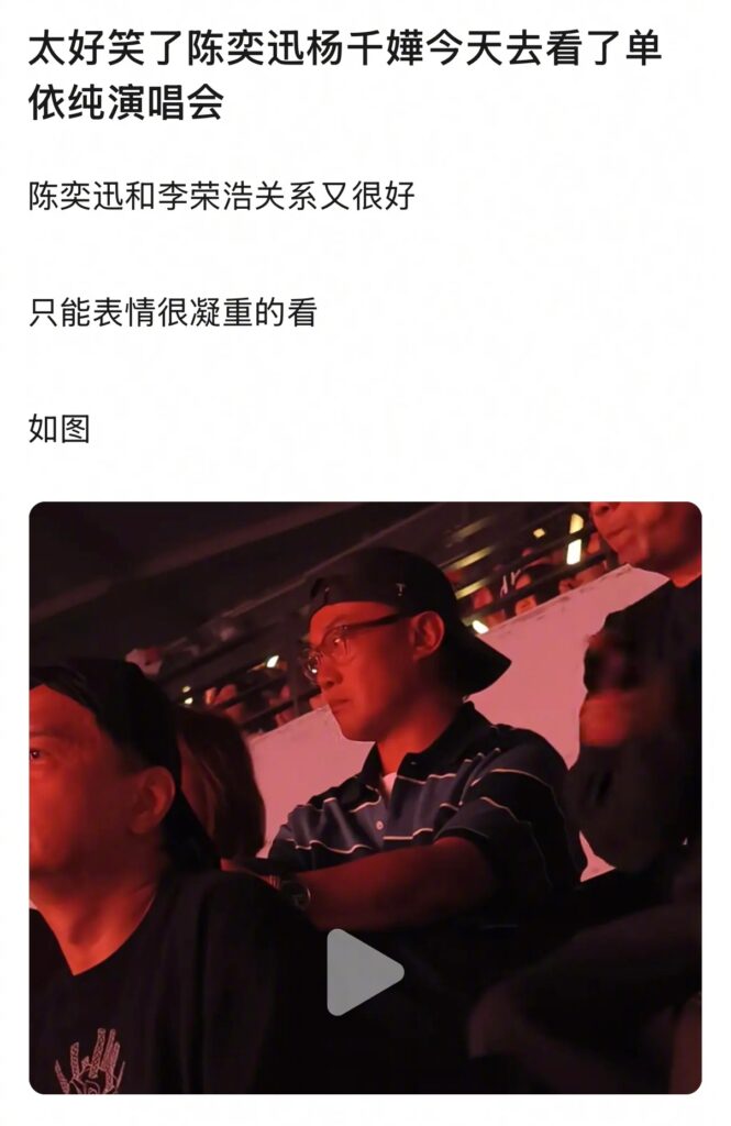 這股討論熱潮與近日的音樂版權爭議有關。就在前一天(3月28日),李榮浩才發文指控單依純未經授權在演唱會上演唱他的歌曲《李白》。陳奕迅與李榮浩私交深厚,兩人合作超過10年,李榮浩曾為陳奕迅創作《陰天快樂》、《娛樂天空》,兩人也多次互當演唱會嘉賓並合拍電影,因此這次陳奕迅去看單依純演唱會,反應格外引人注目。