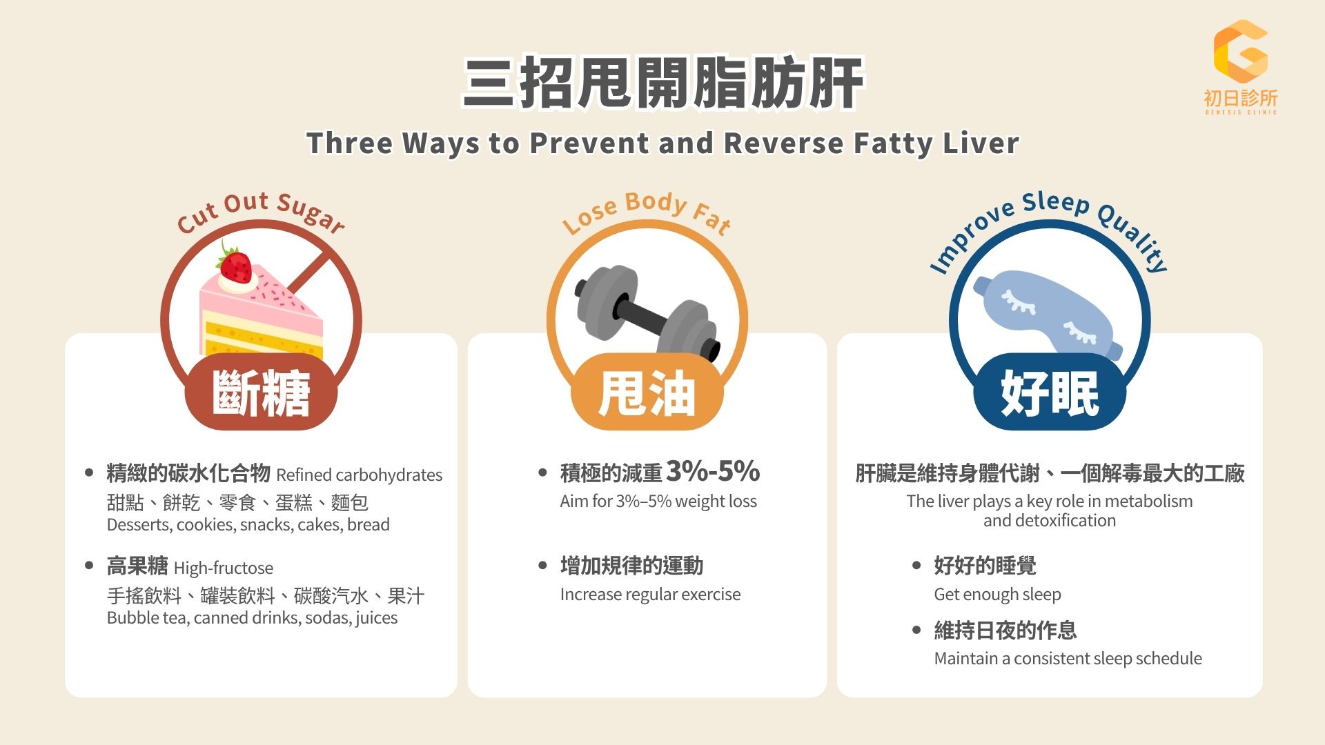 3、良好睡眠: 肝臟是身體最大的代謝與解毒工廠,需要充足的時間休息修復。作息不正常或熬夜會讓肝臟無法修復,進而加重脂肪肝。