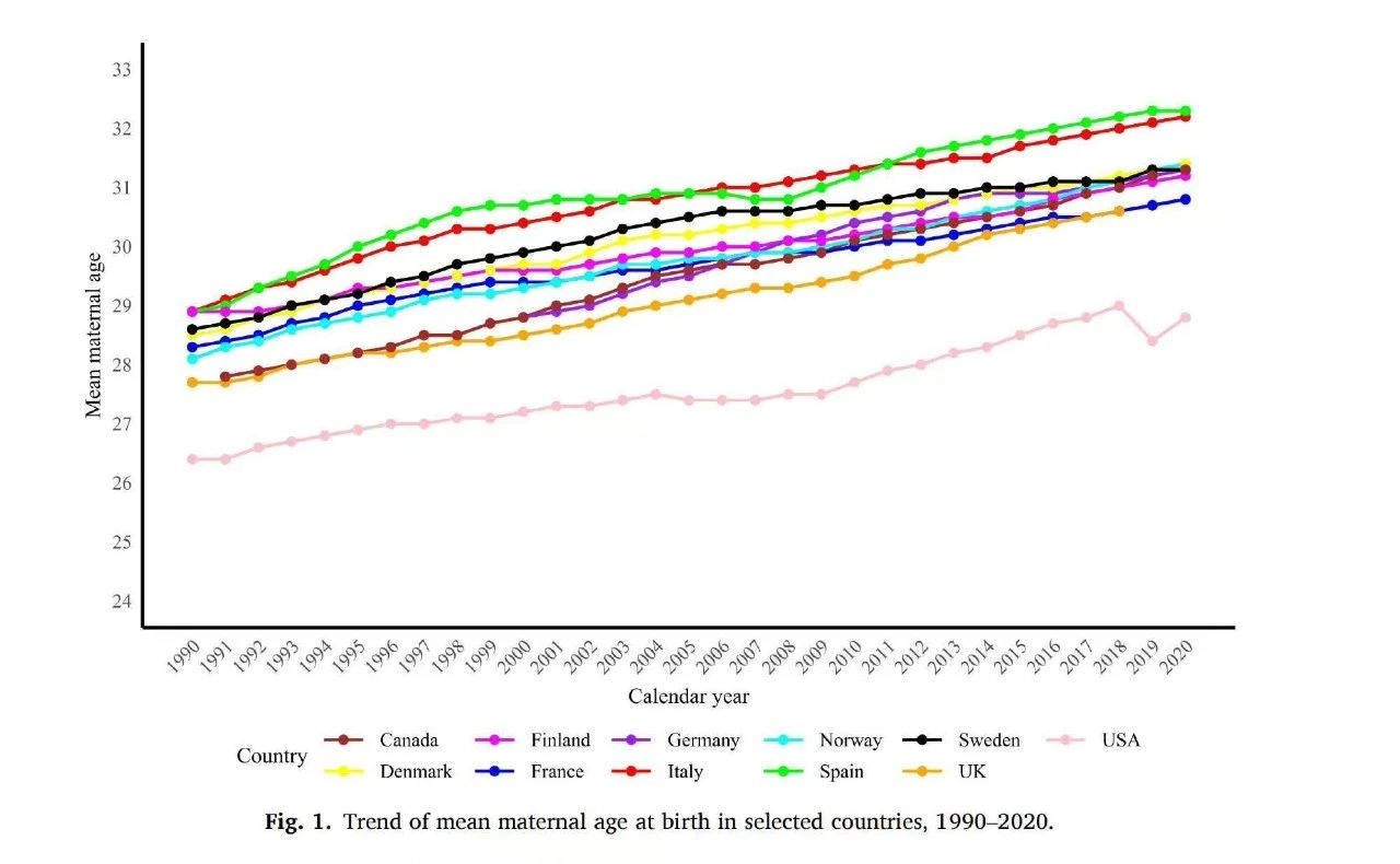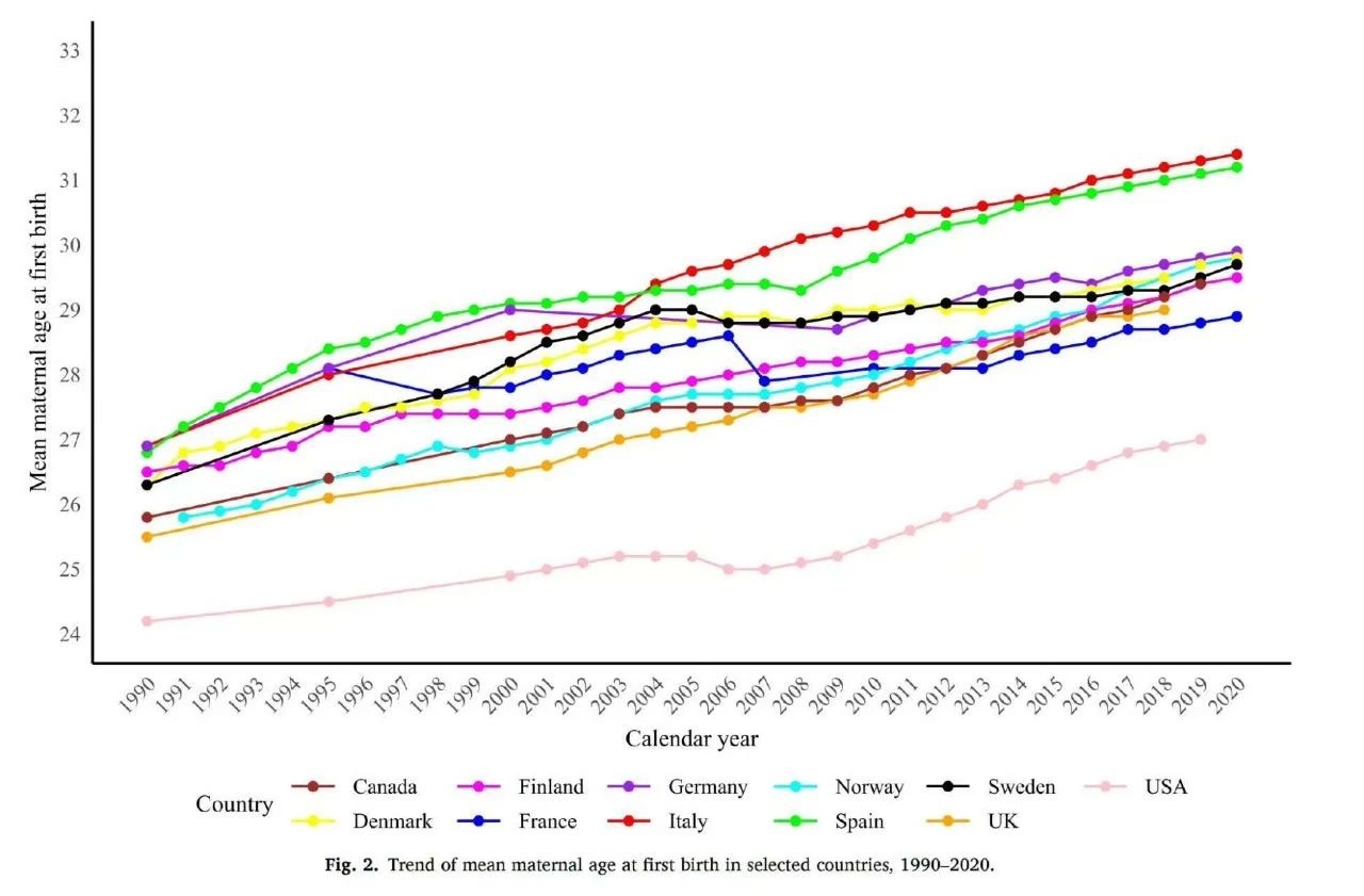 這篇科普文的重點在於提醒大家,生育只是妳眾多選擇當中的一個選擇而已,妳還可以做很多妳自己想做的事情,不必被這樣一條線限制妳的選擇。每個國家都有這個「黃金生育年齡」嗎?一篇文獻詳細記錄了一些國家從1990~2020年近30年生育年齡的變化,圖1是初次生育的平均年齡,圖2整體生育的平均年齡,從趨勢來看,整體都傾向於漸漸延後生育年齡,大致是從過去的28歲,到了現在的30~32歲。