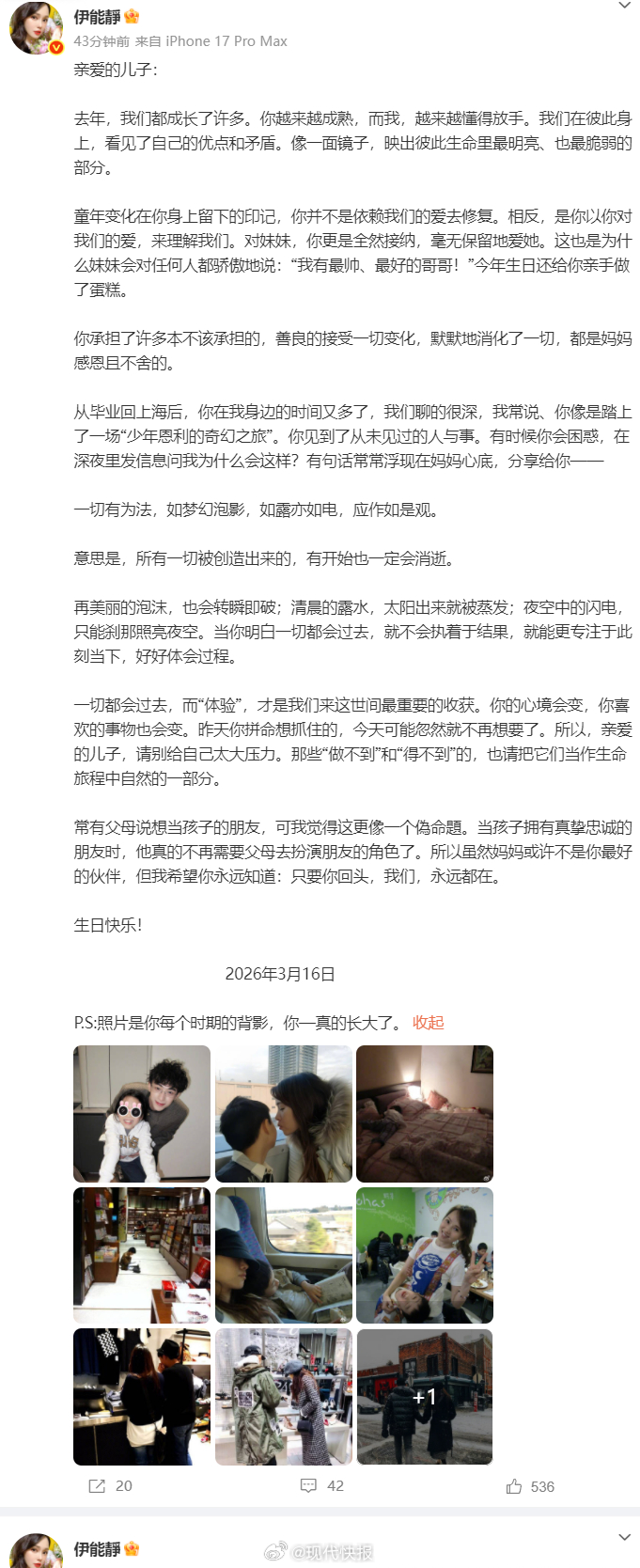 恩利在發文中感性分享24歲的成長感悟,坦言成長最深的感受是感恩,並認為愛自己必須先學會愛身邊的一切,文字顯得通透又溫暖。在生日當天,最引人注目的是米粒親手為哥哥製作生日蛋糕,童趣的裝飾承載著滿滿心意。伊能靜也透露,米粒常自豪地說:「我有最帥、最好的哥哥!」展現出深厚的兄妹情誼。