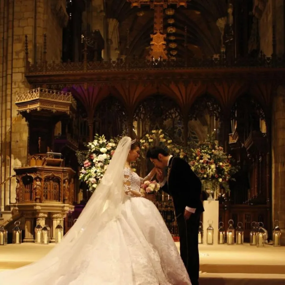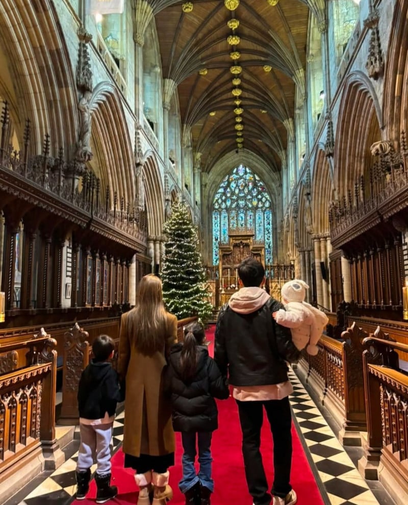 夫妻倆還重返婚禮地點——英國約克郡塞爾比修道院教堂,在紅毯上拍下背影照。這次的畫面不僅有昆凌當年絕美婚紗的回憶,更多了三個孩子的陪伴,周董還單手抱著小女兒,和昆凌一起牽著大女兒與兒子,畫面溫馨又甜蜜。
