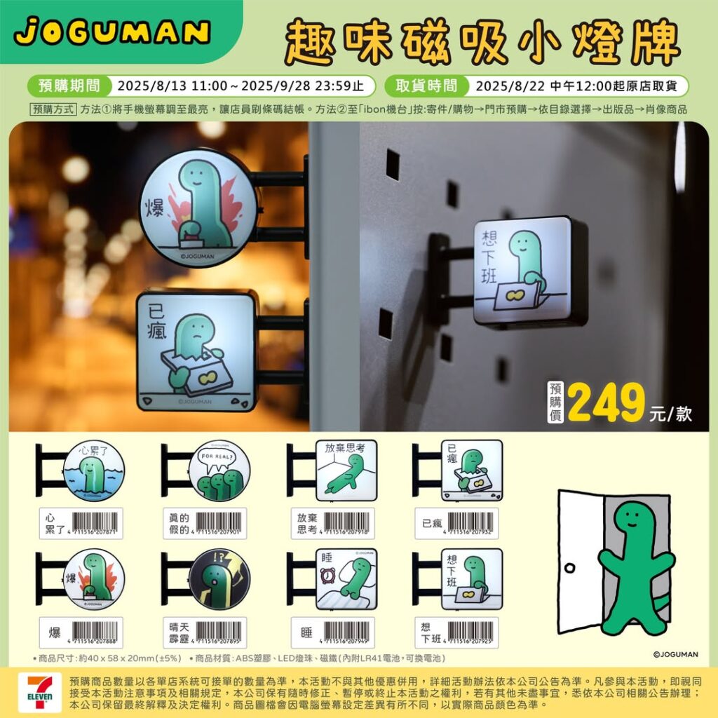 療癒系萌物粉絲們尖叫注意!7-11再次出招,推出全新IP周邊商品「JOGUMAN磁吸小燈牌」、「JOGUMAN手機鏡架」,將社畜日常與可愛爆擊完美結合,從8/13上午11點起於7-11-ibon平台開放限量預購,數量售完為止,想入手的粉絲千萬別慢半拍。