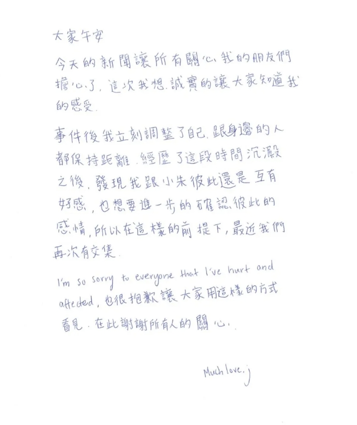 對於再次因為戀情登上版面,吳卓源在信末感性地用英文表達歉意:「I’m so sorry to everyone that I’ve hurt and affected(我對所有被我傷害和影響的人深感抱歉)。」她也坦言,很抱歉讓大家用這樣的方式看見她的近況,並向所有持續關心她的朋友致謝。