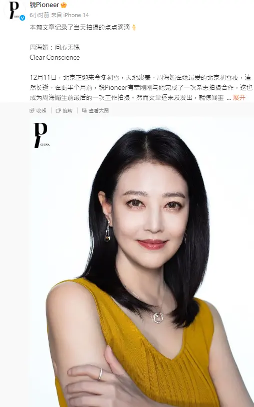 周海媚過世前半個月,受雜誌《銳Pioneer》邀請拍攝封面照,曝光的成品,她換穿多款華服,舉手投足、一顰一笑都散發仙氣和風韻,小編寫下:「12月11日,北京正迎來今冬初雪,天地裡素。周海媚在她最愛的北京初雪夜,溘然長逝…有幸剛剛與她完成了一次雜誌拍攝合作,這也成為周海媚生前最後的一次工作拍攝。古人說,逝世下雪,代表著逝者清淨廉潔,來生可享清福。」