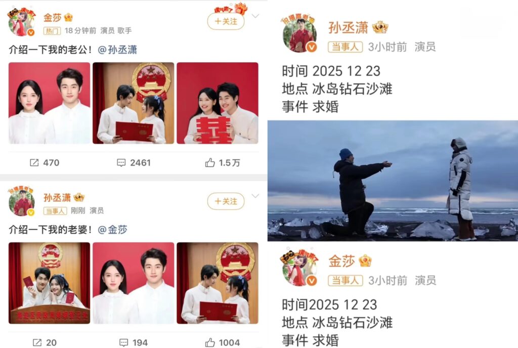 不過,兩人感情並未受流言影響,2025年12月,孫丞瀟在冰島鑽石沙灘的極光下,向金莎單膝下跪求婚。金莎事後幽默自爆,為了拍出完美畫面,那場求婚實際上拍了4遍,但當下的感動是非常真實的。