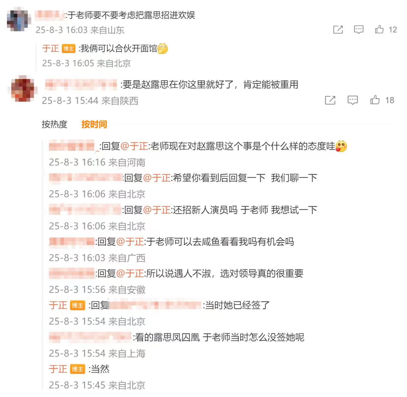 「麵館宣言」一出,網友紛紛湧入編劇于正微博留言「簽下露思吧」,他則幽默回應:「我倆可以合夥開麵館!」被問到先前為何不招攬趙露思,他解釋「當時她已經簽了(別的經紀公司)」,似乎語帶惋惜。