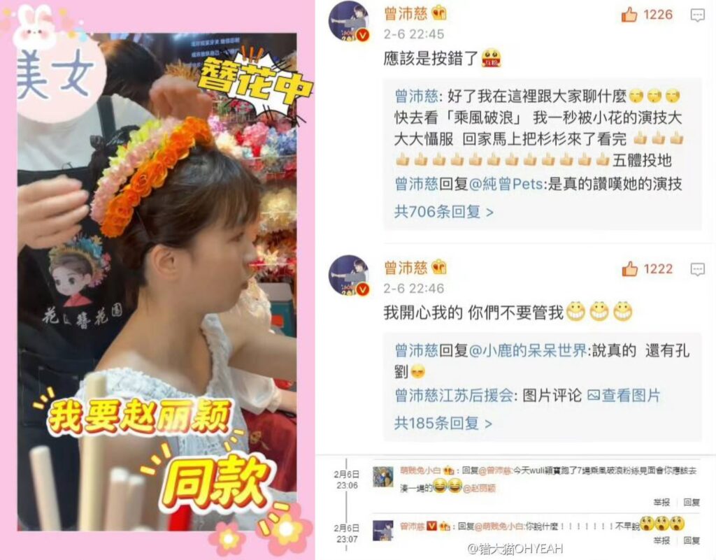 曾沛慈的追星行為不僅止於此。她在受訪時被問到最想挑戰的角色,毫不猶豫地選擇了趙麗穎在《楚喬傳》中飾演的「楚喬」,認為該角色情感層次豐富,俠女風範讓她非常嚮往。甚至後來到泉州旅遊體驗傳統的簪花造型時,曾沛慈也特別要求造型師做出趙麗穎同款的配色,並在個人Vlog封面高調標註「我要趙麗穎同款」,鐵粉身份表露無遺。