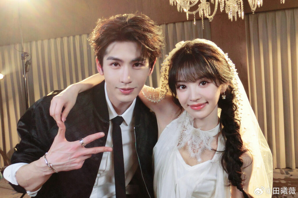 照片中,田曦薇穿著飄逸白裙,頭戴綴有碎花裝飾的蕾絲頭紗;張凌赫則是一身黑色西裝,顯得俊朗挺拔。兩人有著22公分的超萌身高差,現場互動更是甜度爆表,不僅重現劇中經典台詞,張凌赫還上演「背後抱量腰圍」、低頭輕吻手背等動作,甚至在田曦薇上樓梯時自然地伸手攙扶。