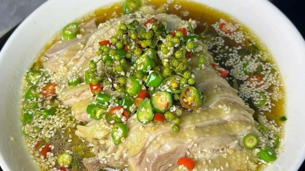 椒麻醬汁:青花椒1小匙、青紅辣椒各1根、醬油2湯匙、雞精1小匙、鹽少許、水1湯匙,再淋上熱油拌勻