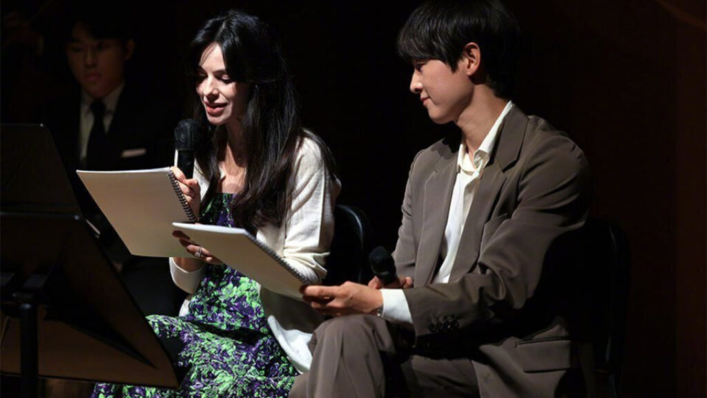 當晚,宋仲基身穿深色西裝,氣質儒雅,凱蒂則以碎花裙亮相,兩人共同用法語為演出段落擔任旁白朗誦。據了解,這場音樂會以「融合藝術」為主題,結合了身障學生的畫作進行多媒體表演。凱蒂不僅主動提出參與構想,夫妻倆更是不收酬勞義演,善舉獲得網友一致稱讚。