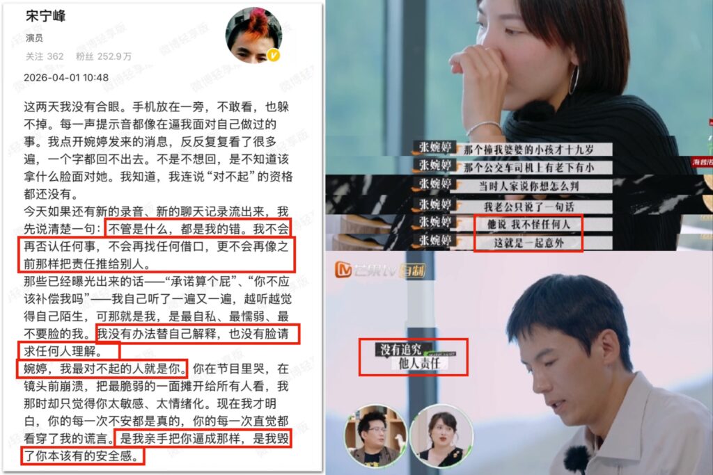 近日,曾參與實境節目《再見愛人》的男星宋寧峰,因被爆出婚內出軌且有錄音流出,形象遭受重創。錄音中疑似他親口說出「承諾算個屁」、「妳破壞我的家庭,不該補償我嗎?」等語句,讓許多曾因他在節目中表現出沉默、包容而感到同情的觀眾大感震驚。這起事件不僅讓大眾重新審視宋寧峰的個人形象,也引發了對於感情中「老實人」標籤的深度討論。