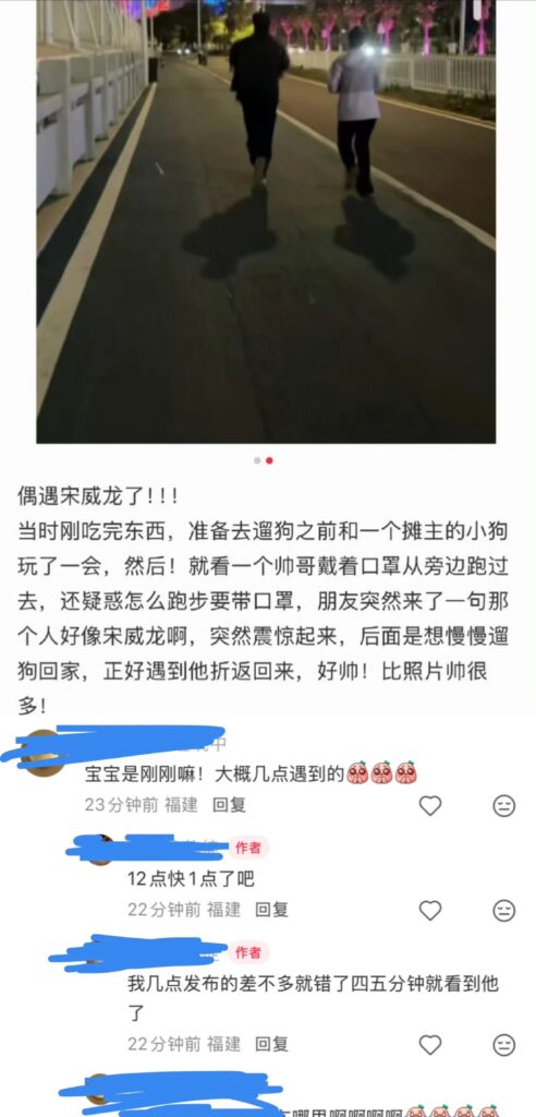 目擊網友在社群平台分享偶遇經過,描述宋威龍本人骨相立體、肩寬腿長,即便戴著口罩,依舊難掩出眾的帥氣,體態甚至比照片更顯挺拔。最讓粉絲驚喜的是他的親民態度,被認出後並沒有閃躲或擺架子,反而自然地與路人擦肩而過,被網友稱讚像鄰家男孩般隨和。