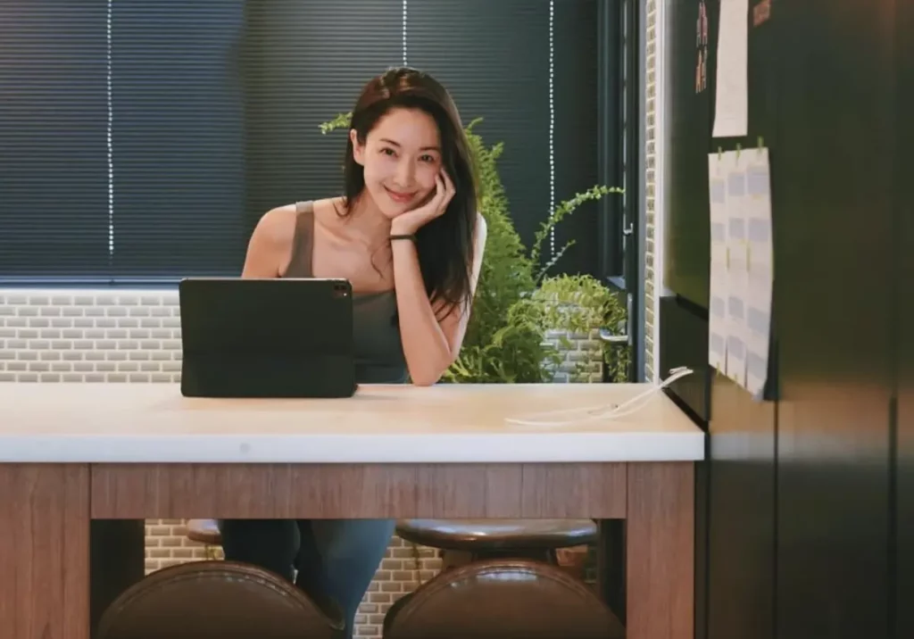 只見隋棠的新家廚房,不僅擁有超大流理台,還有兼具中島功能的吧台,一旁還有植栽造景,在溫暖的黃光照射下,看起來更加溫馨。隋棠還拿著筆電坐在吧台,對著鏡頭露出甜美微笑,貌似偶爾會在此處辦公。