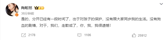 3月25日,曾在《後宮甄嬛傳》裡飾演安陵容的女演員陶昕然官宣離婚:「是的,分開已經有一段時間了,出於對孩子的保護,沒有跟大家同步我的生活。沒有狗血的劇情,對於,我們,走散成了,你,我,我很遺憾!」
