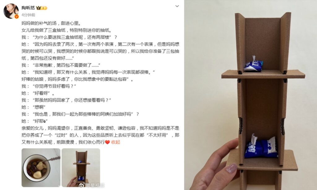 陶昕然在《乘風2026》第二次公開演出中,雖然團隊總分拿下第二名,卻因為個人票數僅27分而慘遭淘汰。26日,陶昕然在社群平台曬出女兒親手做的三層迷你面紙樓房,設計非常有巧思。女兒解釋,這三層分別對應媽媽在節目中的三次舞台表演,並貼心地說:「媽媽想哭的時候可以哭,就像我難過時妳總是告訴我可以哭一樣。」