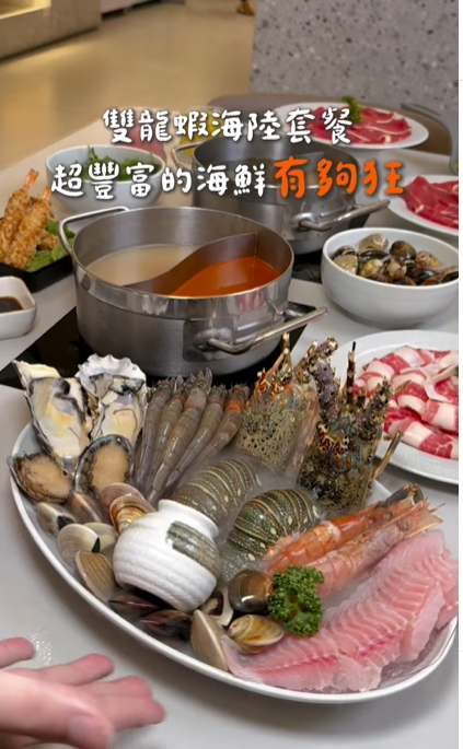 特派員這次品嚐「雙龍蝦海陸雙人套餐」,兩隻龍蝦直接霸氣上桌,搭配白蝦、紅蝦、生蠔、蛤蜊、魚片等澎湃海鮮,一次滿足所有海鮮控的夢想!店家還貼心將龍蝦去殼處理,肉質Q彈鮮甜,每一口都是精華海味。