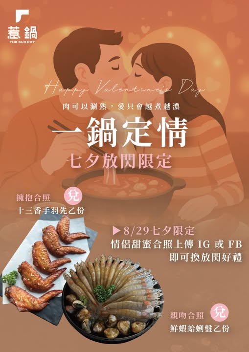 「鍋愛放閃日」活動僅限8月29日當天,錯過就要再等一年。惹鍋提醒所有情侶們,無論你們是低調還是高調,七夕都值得用一鍋好料來紀念,別讓愛只停留在訊息裡,把感情端上桌,才是真正的浪漫。