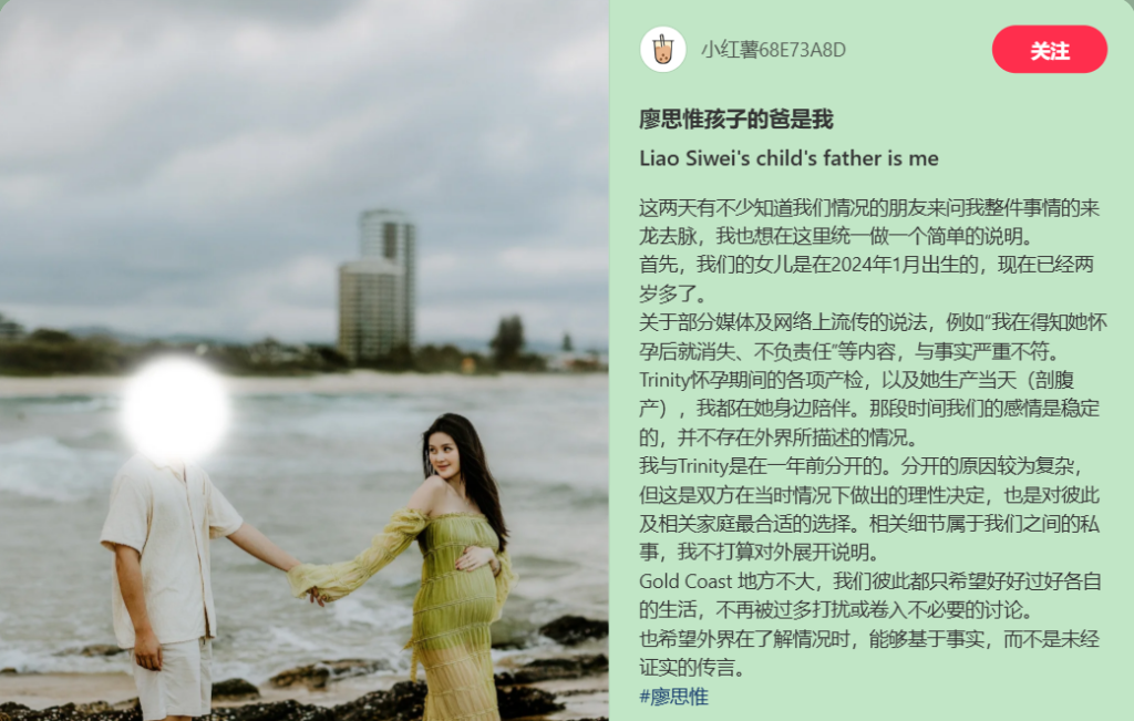 正當外界將男方貼上「負心漢」標籤時,事件出現了反轉。一名自稱為孩子生父「Jerry」的男子,透過社群平台小紅書發文澄清,並貼出與孕婦的合照、產檢照等證據,強調自己從懷孕到生產全程陪伴,分手是雙方的理性考量,對兩人和彼此家庭都是最好的選擇。