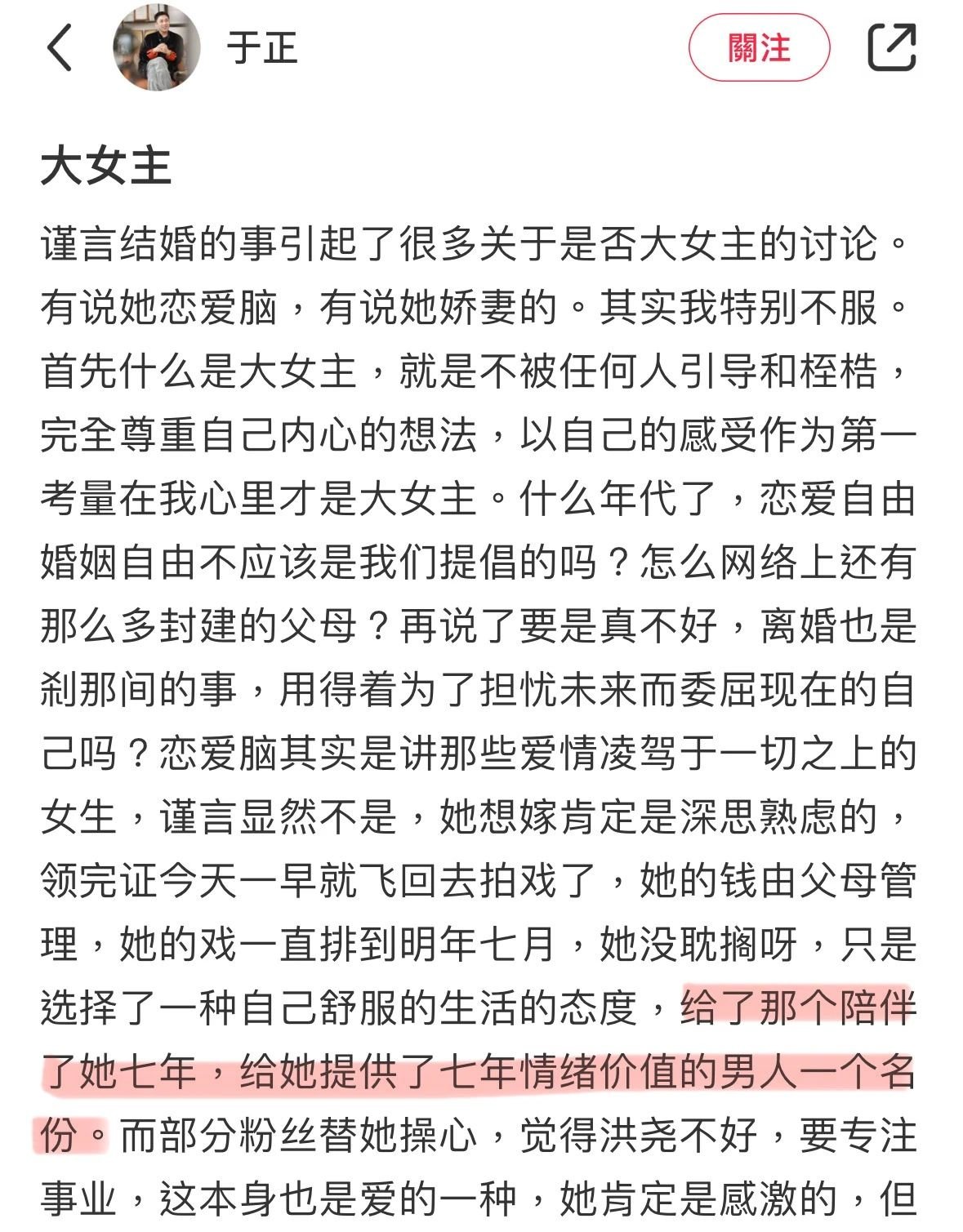 吳謹言和洪堯的相識,官方的說法是始於《延禧攻略》。這段戀情一開始就沒有得到網友們的祝福,反而是眾口一詞的不看好,待七年之後結婚之際更到達高潮,面對鋪天蓋地的唱衰,兩位當事人乾脆隱身。反倒是于老闆成為這場婚事的第一主角,他開始充當二人的發言人,又是發小作文,又是在評論區和網友線上對罵,連著好幾天在網上瘋狂開麥。