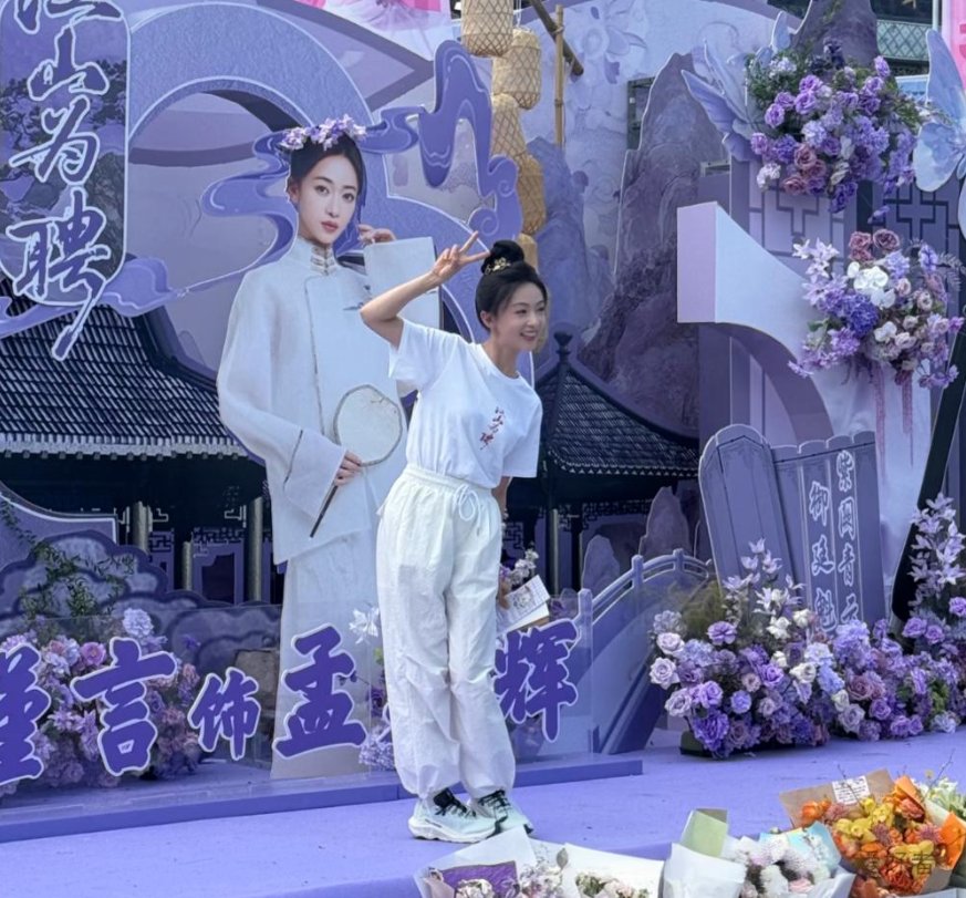 當日,她身穿簡約白色T恤與休閒褲,搭配俏麗丸子髮型,隨性又有活力,T恤上印有《江山為聘》劇名標識。最引人注目的是,她皮膚白皙透亮、神采奕奕,不見產後疲態,反因臉頰略顯圓潤,更添溫婉親和,宛如瓷娃娃般精緻。現場她親切與工作人員交流,耐心回應粉絲合影請求,臉上始終帶著溫柔笑意。成為母親後,舉手投足間更添成熟與篤定,網友直呼:「狀態好到逆天!」