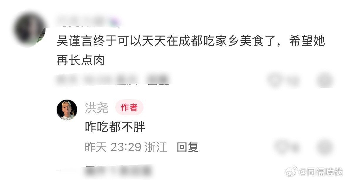 近日,有網友在吳謹言的社群動態下留言,希望她多吃點成都家鄉美食、身材再圓潤一些,老公洪堯隨即留言回應「咋吃都不胖」,一句話不僅隱含秀恩愛意味,也讓外界再次聚焦吳謹言長期維持纖細體態的生活方式。