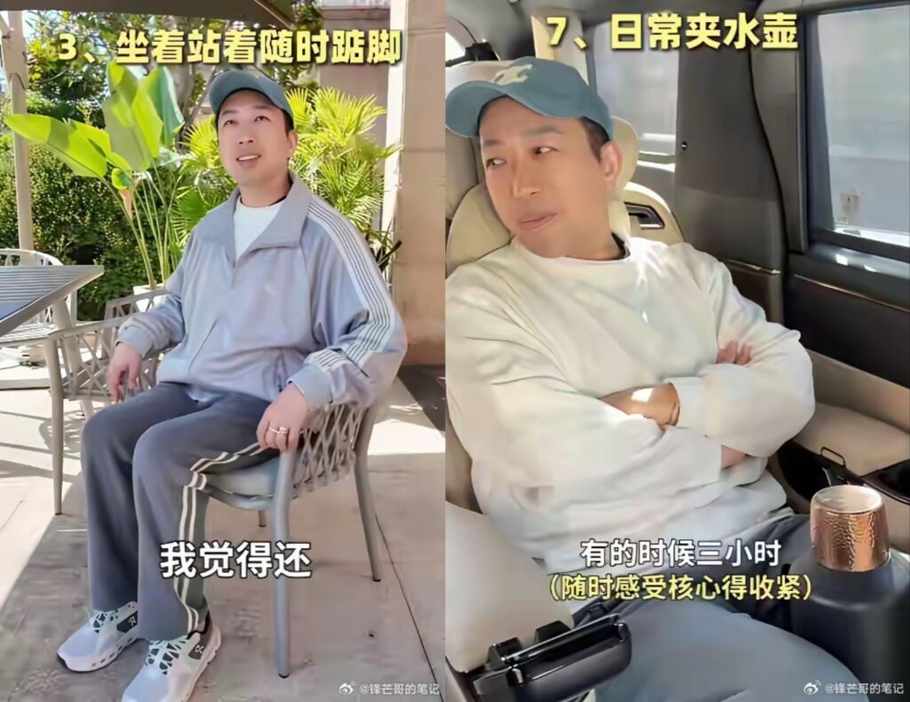 于正分享的方式相當嚴格。運動方面,他每天早上空腹進行1小時重量訓練,分為上肢、核心與下肢三天輪流,再加上30分鐘橢圓機有氧運動,每三天休息一天。日常生活中也加入零碎訓練,例如刷牙時踮腳、搭車時夾水壺訓練核心,甚至穿著10公斤負重背心行走,以提高活動量。