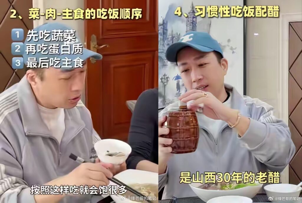 飲食控管同樣細緻。他每天只吃兩餐,進食順序固定為先吃蔬菜,再吃蛋白質,最後才吃碳水化合物,全程少油、控制糖分。午餐前會喝加入肉桂粉的黑咖啡,晚餐前喝蘋果醋,主食以蒟蒻取代精製澱粉,並規定凌晨12點前入睡,以黑巧克力取代甜食。