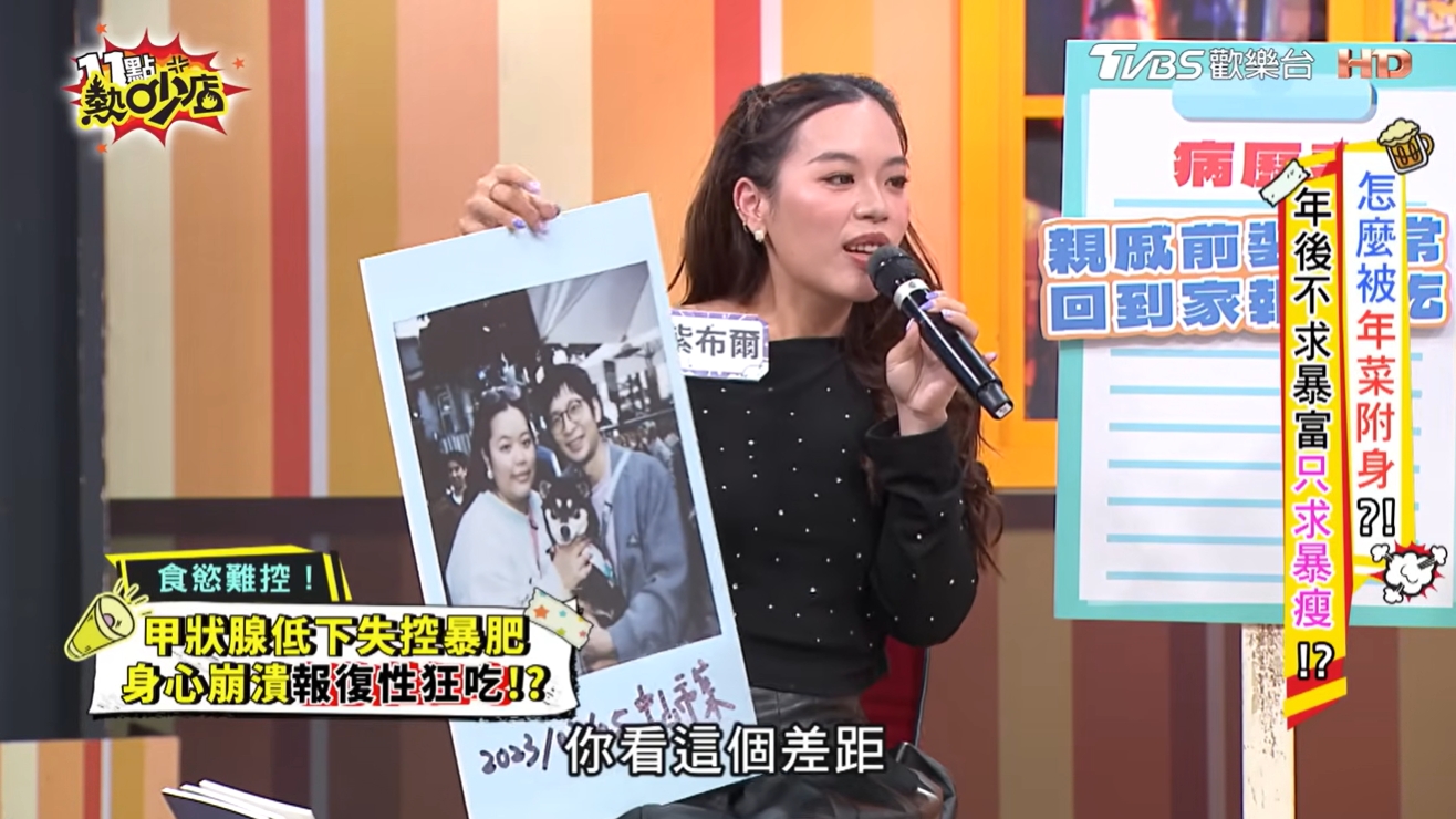 排灣族歌手紫布爾(娃娃)近日上節目《11點熱吵店》,分享幾年前因生病而嚴重發胖的辛酸。她原本長年維持48到50公斤,但大約在2019年左右出現異狀,明明生活習慣沒有改變,體重卻在1個月內增加了5公斤,體力也變得比以前差,就醫才知道原來是罹患了「甲狀腺機能低下」。